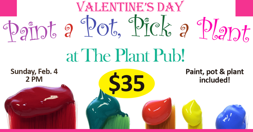 Express some creativity and get a new plant! Makes for a personal gift for Valentine’s Day as well! This event usually takes approximately two hours with painting and drying time but can be as long or as short as you want. 12 spots available–secure yours by clicking the “register” button below and paying through our online Square checkout link.